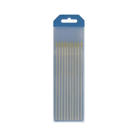 Lot de 10 électrodes tungstène WL15 (extrémité or), consommables pour soudage TIG Les électrodes de tungstène permettent de former l’arc électrique au bout de la torche. Elles doivent être affutées en cas de contact avec la pièce • Electrodes de marque GYS composées de 1,5% d’oxyde de lanthane (non radioactives)• Polyvalentse, elle sont utilisables en courant continu (DC) pour l’Acier, l’Inox et en courant alternatif (AC) pour l’Aluminium • Elles sont particulièrement adaptées pour le soudage de matériaux purs ou d’alliages Aluminium, Titane, Nickel, Cuivre et Magnésium• Bonne qualité d’amorçage• Meilleure durée de vie • Diamètre 2 mm / Longueur 150 mm
