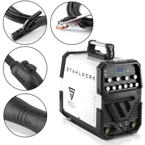 Installation de soudage TIG AC/DC avec fonction MMA E-hand. Puissant 200 A pour le soudage, parfait pour le soudage de l’aluminium + tôles minces.