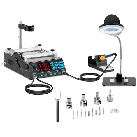 Cette station de soudage numérique a été conçue notamment pour des activités industrielles comme les réparations ou la construction. Elle convient également pour le loisir des utilisateurs expérimentés en électronique. La structure compacte et les poignées ergonomiques de la station la rendent mobile et surtout économe en place. Évidemment, toutes les stations de soudage de Stamos Soldering ESD sont fiables et sûres ! L’alimentation électrique de l’appareil est connectée à la base de la station dans laquelle vous pouvez trouver tous types de fonctions et raccords dont vous avez besoin. De plus, elle dispose d’un grand écran-LED de qualité indiquant avec précision la température de vos deux outils (Fer à braser et buse à air) De plus, la station de soudage S-LS-10 est équipée d’un support latéral pour la buse à air chaud et d’un support à fer à souder muni d’une éponge sèche. La buse à air chaud d’une puissance de 650 Watts convient tant pour le brasage standard que pour le brasage de Composants Montés en Surface (CMS), qui nécessite une technologie de séchage à l’air chaud. La résistance intégrée du fer à braser vous garantit une transmission de chaleur des plus efficaces. En plus de la station en elle-même, de la buse à air chaud et du fer à braser, vous recevrez également les accessoires suivants: une lampe-loupe grossissante pour les opérations de brasage, 9 pannes de soudure, 4 buses à air chaud, des brucelles de soudage pour manipuler des composants chauds, une mèche de dessoudage pour rectifier un élément ainsi qu’un cric adapté